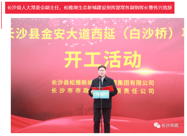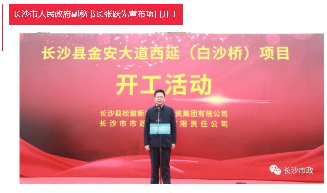 4月19日上午,長沙縣金安大道(含白沙河橋)西延項(xiàng)目開工活動(dòng)隆重舉行。長沙市人民政府副秘書長張躍先,長沙縣委副書記、縣長、松雅湖生態(tài)新城建設(shè)指揮部指揮長陳永高,松雅湖生態(tài)新城建設(shè)指揮部常務(wù)副指揮長曹偉興,長沙市市政工程有限責(zé)任公司董事長陳懷柏出席活動(dòng)。長沙縣松雅湖生態(tài)新城發(fā)展中心書記羅衛(wèi)滋主持開工活動(dòng)。